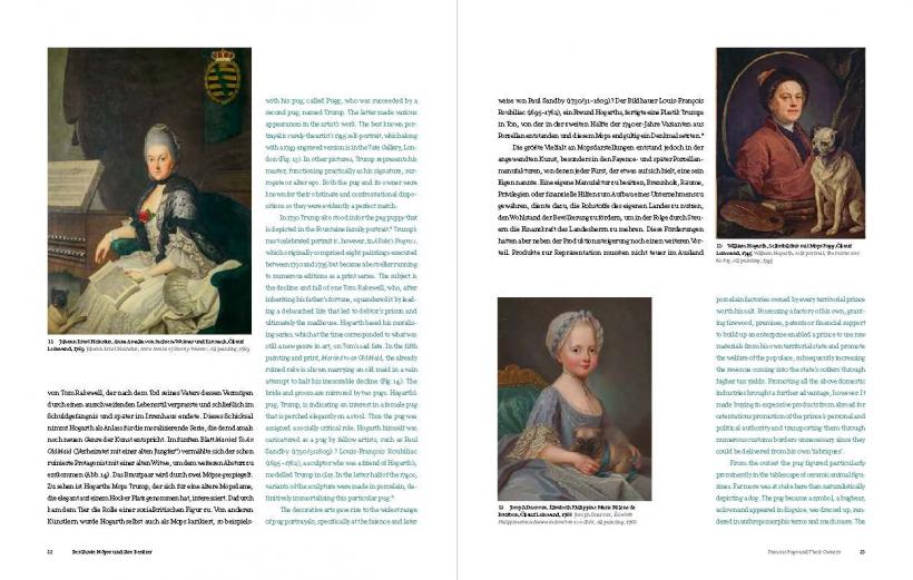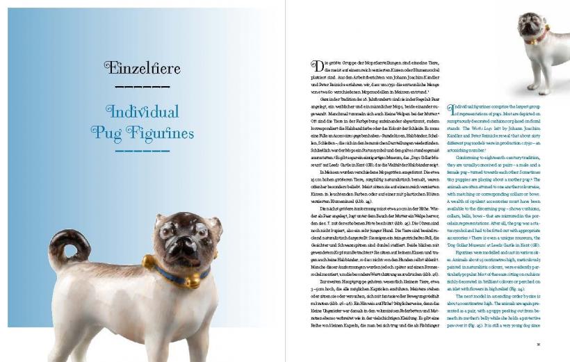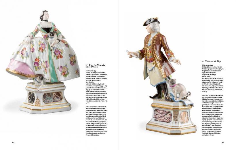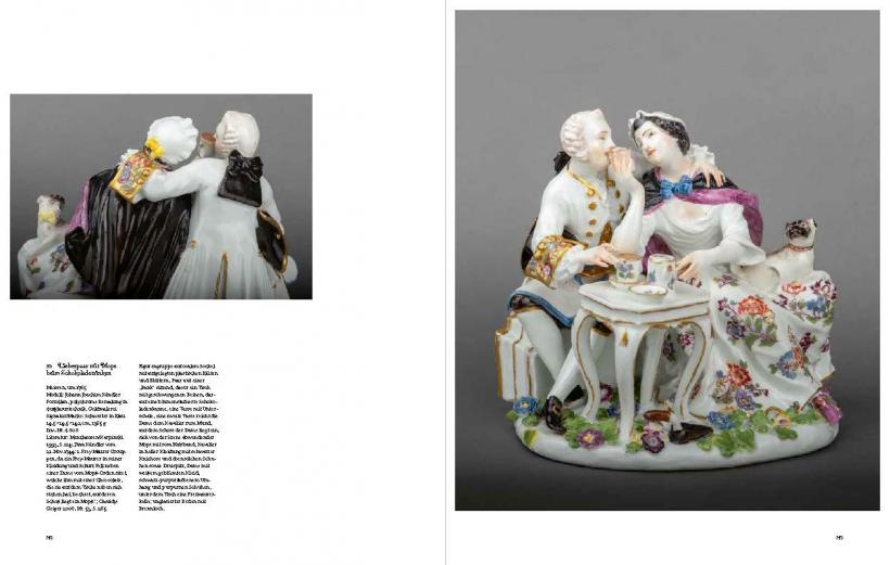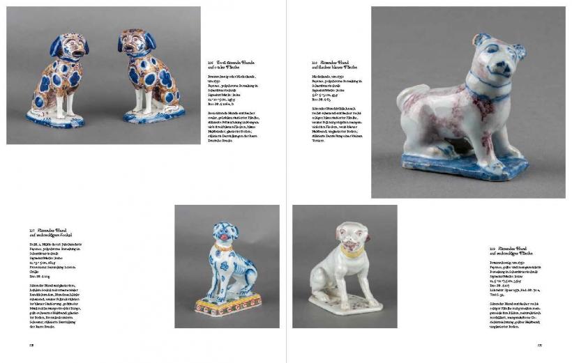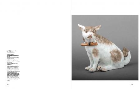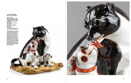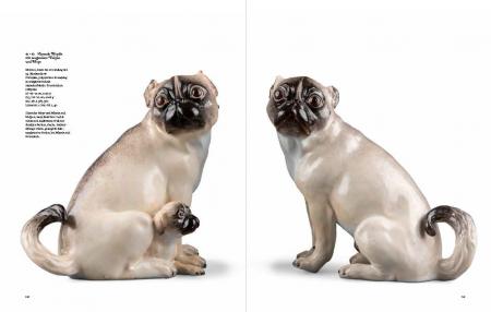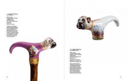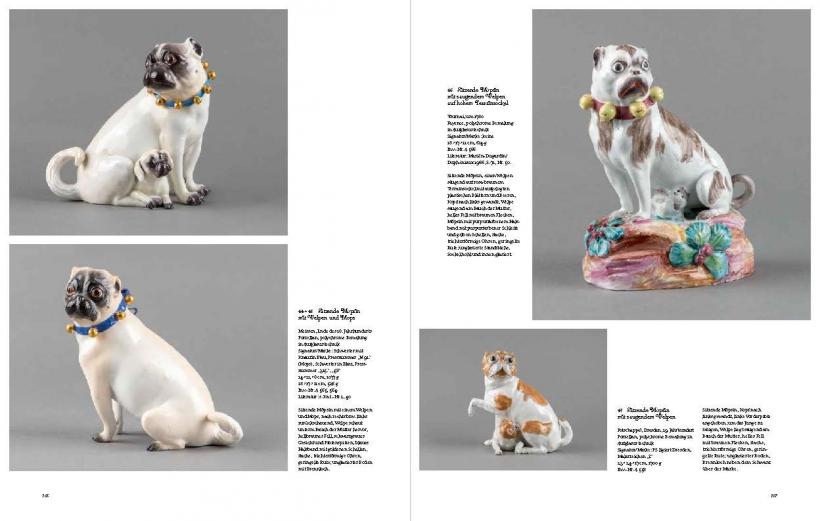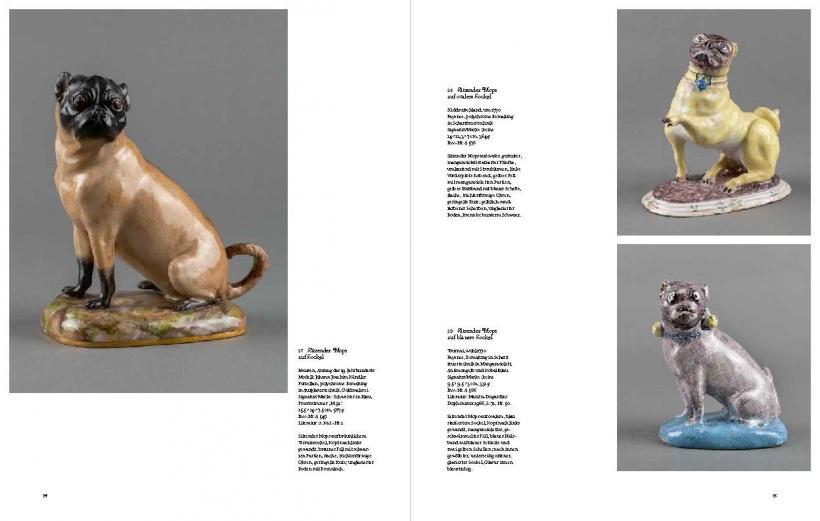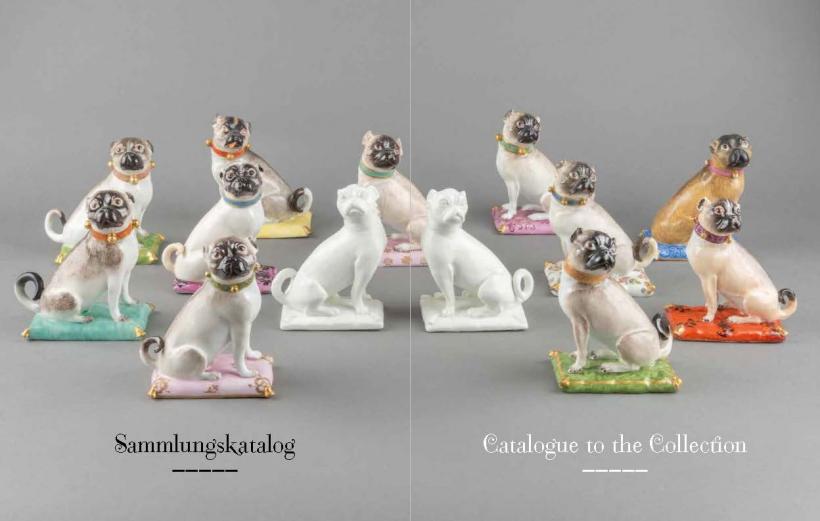 In the 18th century, pugs found their way onto the laps of noblewomen and, with this, into the portraits of contemporary rulers. Small and forever panting, the pug could not be put to use as a watchdog or a herding dog, but it compensated for this with its charm. The dog ultimately found its way onto porcelain and faience. Johann Joachim Kändler, the most significant modeler of the Meissen porcelain manufactory, designed over 60 variants of the pug between 1740 and 1760 – standing, lying, scratching, and performing tricks. Kändler portrayed the pug belonging to Count Heinrich von Brühl in a splendid one-off, but he also produced models for serial production. This southern German collection comprises over 150 ceramic pugs as well as other dogs. Moreover, they do not just appear individually; they may also be part of a courtly scene or decorate wares in the gallant style – accessories such as flacons, (snuff) boxes, and walking-stick handles.