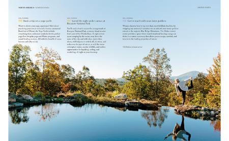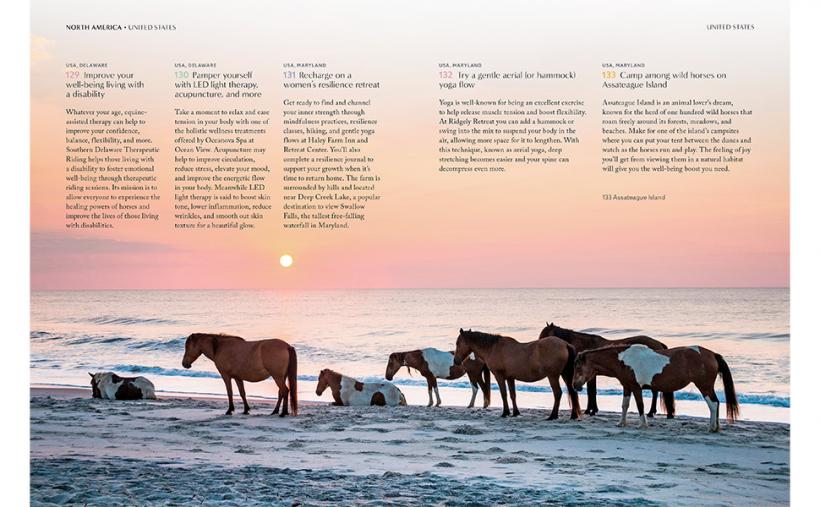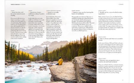 Entries are broken down into six color-coded categories to help readers personally create the ultimate wellness escape for their needs at any time. The six categories are: renew and recharge; relax and indulge; explore and thrive; reflect and connect; savor and nourish; heal and balance.