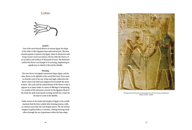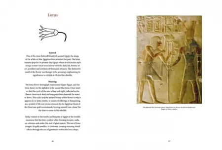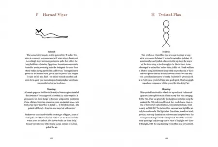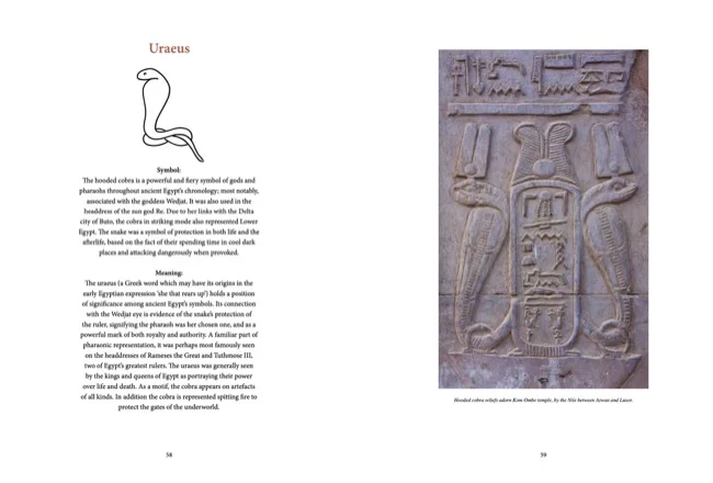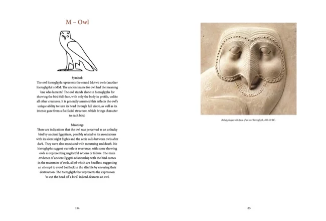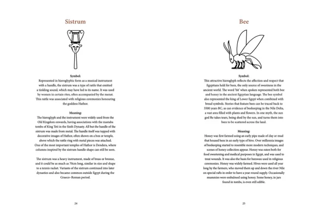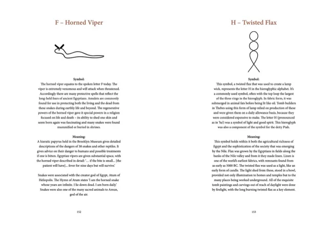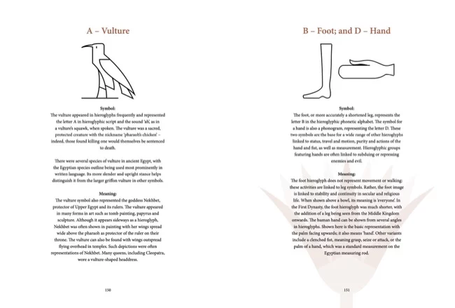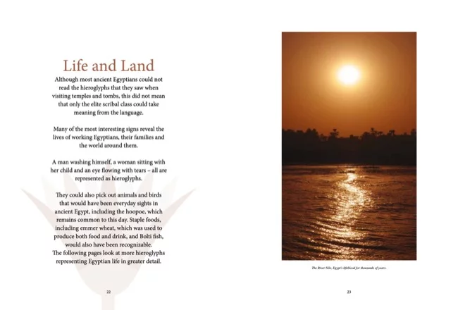 У книзі «Ілюстровані давньоєгипетські ієрогліфи» дослідіть логограми для пошуку популярних концепцій, таких як «сонце», «дім» та «гора», а також складніших ідей, таких як Аджет або «сонце, що сходить над горами»; помилуйтеся повним ім'ям Тутанхамона, позначеним на його гробниці, яке зображено за допомогою очерету, хвилі води, сокола, символу анкх та серії палиць; дізнайтеся про дві витягнуті руки символу Ка, що символізує смертне життя та душу людини; та помилуйтеся Уроборосом, символом, що зображує змієподібну тварину, яка ковтає власний хвіст, що символізує вічну боротьбу.