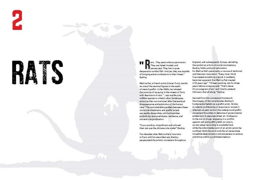 У цій книзі представлено багатство, різноманітність і силу творчості найвідомішого художника стріт-арту в світі... але ніхто не знає його особи. Нам пропонується прослідкувати еволюцію художника від Англії до Сполучених Штатів, Франції, Ізраїлю та України, а також через понад сотню емблематичних робіт, усі пояснені. Це оригінальний каталог Raisonné Музею Бенксі, у якому всі ці твори відтворено в їхньому міському контексті, що дозволяє широкій публіці реалістично відкрити їх і зрозуміти їхню силу, включно з тими, які були вкрадені чи зіпсовані та більше не існують.