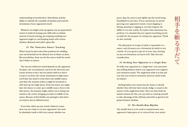 Практический подход Мусаси к боевым искусствам и бою включает в себя отказ от технических излишеств, понимание того, что технику следует понимать просто как победу над противником, и понимание того, что одни и те же качества применимы как в мелких, так и в крупных конфликтах. Он неоднократно подчеркивает важность обучения на практике, а не просто теоретического изучения.
