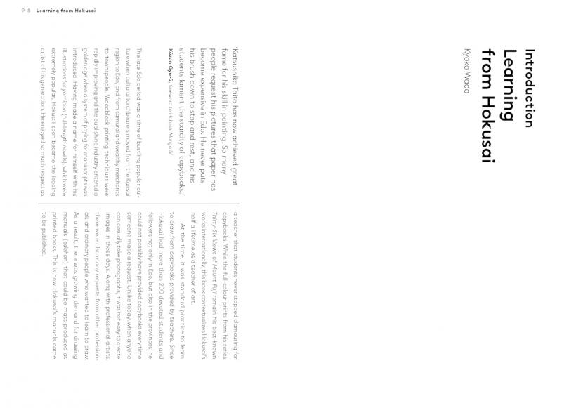 Це збірне видання містить 15 томів е-техон Хокусая, які містять понад 800 ілюстрацій інструкцій з 1812 по 1848 рік. Кожна сторінка точно відтворена порівняно з оригінальними роботами, книга демонструє грайливий підхід Хокусая до малювання за допомогою кумедних пісень, малюнків, складених з літерних форм (попередників сучасних емодзі), сучасних дизайнів для майстрів і, так, танцювальних рухів. Ця всеохоплююча праця також включає цінну роботу, яку він опублікував безпосередньо перед своєю смертю. Це був його magnum opus, що слугував для «збереження всього, чого я навчився».