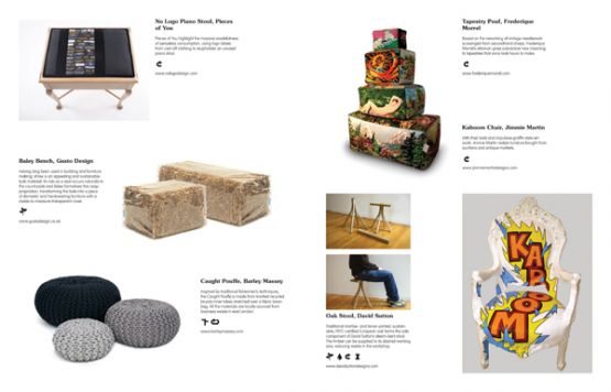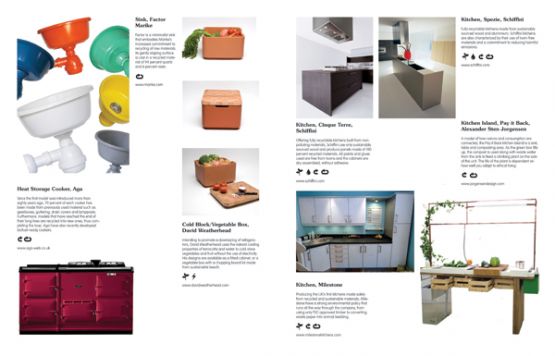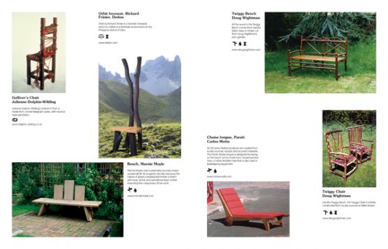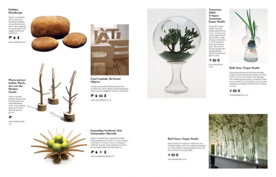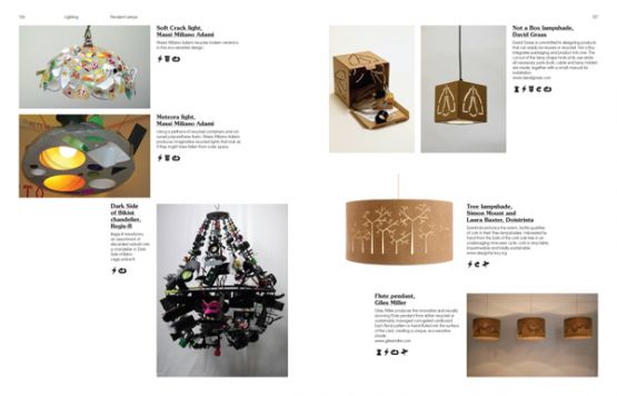 A series of icons show each product’s 'green' credentials; highlighting the use of recycled, sustainable and locally-sourced materials as well as non-toxic, low-energy and low-waste manufacturing processes, so that readers can see at a glance the individual characteristics of each design.