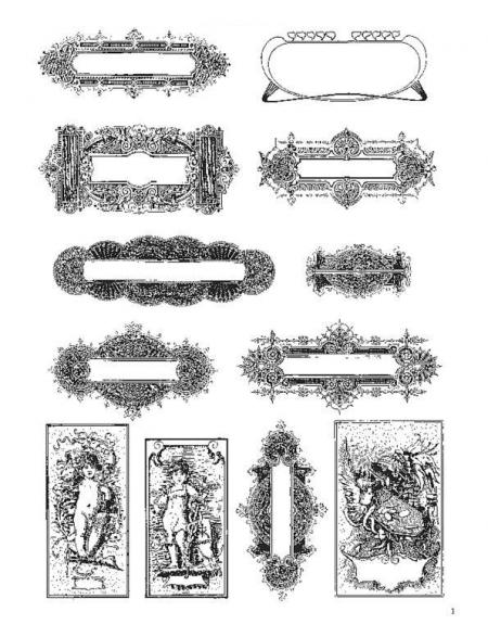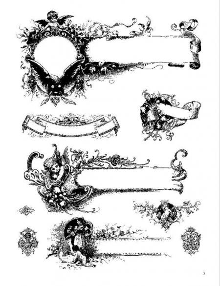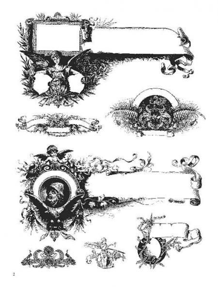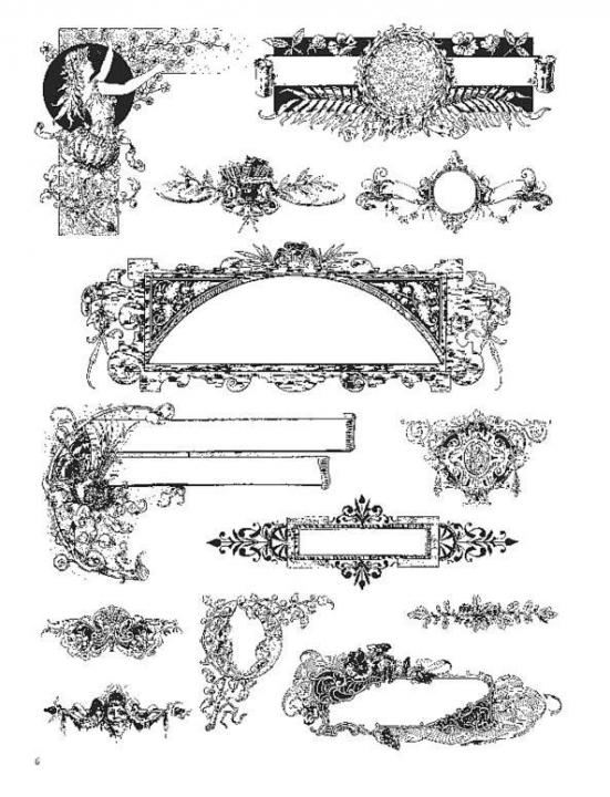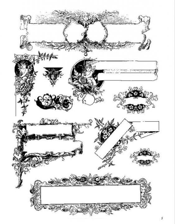 Reproduced from a rare turn-of-the-century German catalog, these royalty-free frames, headpieces, tailpieces, title pages, spot art, scrollwork, and other ornamental motifs include bold Art Nouveau designs along with a wealth of detailed, evocative images of couples dancing, placid landscapes, sailing ships, fairies and elves, beautiful young ladies, floral borders, and much more.
