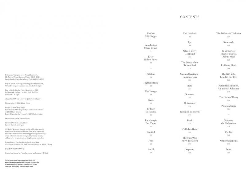 Preface: Sally Singer • Introduction: Claire Wilcox • Essay: Robert Fairer • Nihilism • Highland Rape • The Hunger • Dante • Bellmer La Poupée • It's a Jungle Out There • Untitled • Joan • No.13 • The Overlook • Eye • What a Merry Go Round • The Dance of the Twisted Bull • Supercalifragilisticexpialidocious • Irere • Scanners • Deliverance • Pantheon ad Lucem • Black • It's Only a Game • The Man Who New Too Much • Neptune • The Windows of Culloden • Sarabande • In Memory of Elizabeth Howe, Salem, 1692 • La Dame Bleue • The Girl Who Lived in the Tree • Natural Dis-tinction, Un-natural Selection • The Horn of Plenty • Plato's Atlantis • Notes on the Collections • Credits • Acknowledgements • Index