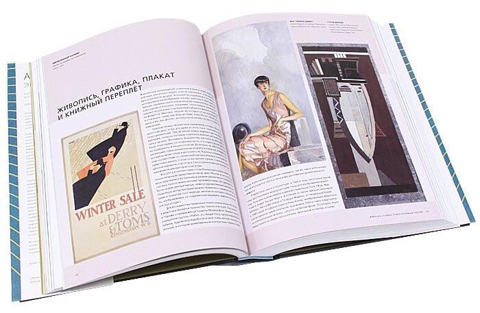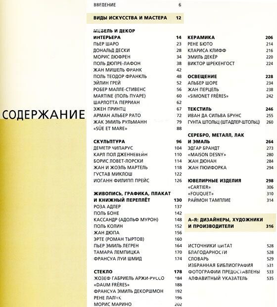 Энциклопедия начинается серией эссе, посвященных мебели и декору интерьеров, скульптуре, живописи, графике, плакату и книжным переплетам. Предметом тщательного исследования являются также художественное стекло, керамика, освещение, текстиль и ювелирные изделия. Каждая глава сопровождается иллюстрациями и подробными биографиями выдающихся мастеров.