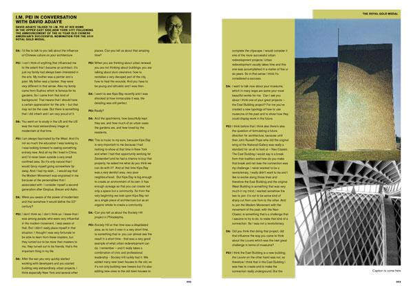 Includes an interview with I.M. Pei, the recipient of this year’s Royal Gold Medal