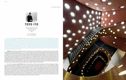 Featured architects and practices include: Ambasz, Aravena, Architektur und Landschaft, Asymptote, Atelier-Den/Inahara, Balmond, Barclay, Barkow Leibinger, Baumschlager Eberle, BIG, Boeri, Byoung-soo Cho, Calatrava, Costa, Elliott, Endo, France-Lanord, François, Fujimori, Fujimoto, Gustafson Porter, Hadid, Herreros, Herzog & de Meuron, HHF, Holl, Information Based Architecture, International Polar Foundation, IROJE KHM, Ishigami, Ito, James Corner Field Operations/DS+R, Jensen & Skodvin, Kalhöfer-Korschildgen, KHR, LAAC, López Mónica Rivera, Greg Lynn FORM, Made in Sàrl, Maki, Morphosis, Moss, Nobis, NOX, Ohtake, OMA*AMO, Paredes Pedrosa, Perrault, Piano, Plasma Studio, Ricciotti, Rich Rotor, Sambuichi, SANAA, del Sol, SOM, Splitterwerk, Sugimoto, Supersudaka, Takasaki, Tokujin, de vylder vinck taillieu