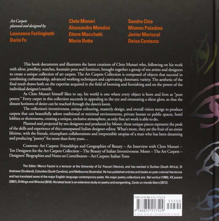 This book is the first to exclusively present Cleto Munaris latest creations in the field of the applied arts. After his jewelery, silverware, watches and furnishings, the great designer has involved ten other designers and artists in the creation of a unique collection of art carpets. Signed by Lawrence Ferlinghetti, Dario Fo, Mario Botta, Alessandro Mendini, Javier Mariscal, Ettore Mochetti, Deisa Centazzo, Sandro Chia, Mimmo Paladino and by Cleto Munari himself, these creations are full-fledged works of art and represent the high point of the skills and expertise of one of the greatest creative designers in the world, who has been designing and producing for over forty years.