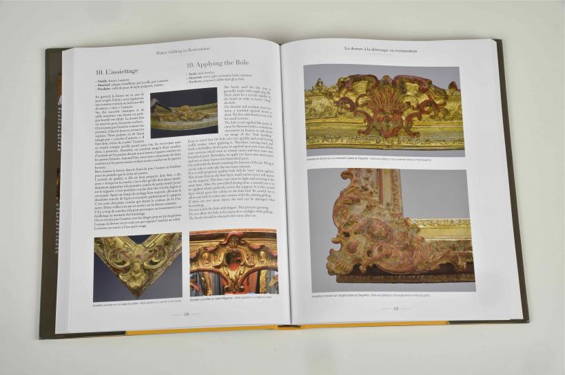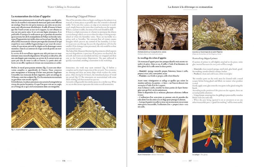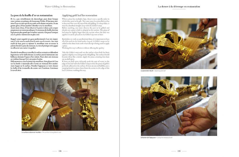 Après quelques réflexions sur la manière d’exercer leur profession dans le cadre du Château, les auteurs passent en revue les produits et outils utilisés. Pour ne rien laisser dans l’ombre, ils n’hésitent pas à faire des reportages chez le dernier batteur d’or de France (la maison Dauvet, active depuis 1764) ou chez un fabricant d’outils de doreurs (les fers à reparer de la maison Da Silva).