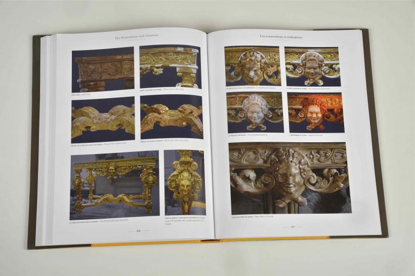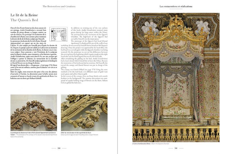 Une vingtaine de chefs-d’œuvre que renferment les collections du Château et qui ont été restaurées par l’atelier de dorure sont ensuite examinés et les interventions décrites avec une illustration riche de détails. Certaines salles ornées de boiseries sculptées et dorées sont prétexte à de magnifiques photographies illustrant le travail des doreurs d’hier et d’aujourd’hui. Les dernières pages traitent de la peinture décorative (faux marbre et faux bois) souvent associée à la dorure. Le livre se termine sur un glossaire, les notices biographiques des artisans cités, une liste de sites Internet, de fournisseurs et d’ouvrages spécialisés.