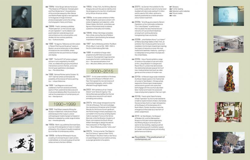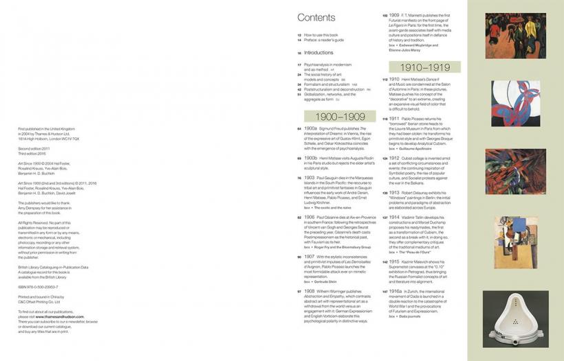 How to use this book * Preface: A reader's guide Introductions Psychoanalysis in modernism and as a method * The social history of art: models and concepts * Formalism and structuralism * Poststructuralism and deconstruction * Globalization, networks and the aggregate as form 1900 - 1909 * 1910 - 1919 * 1920 - 1929 * 1930 - 1939 * 1940 - 1944 * Roundtable: Art at mid-century * 1945 - 1949 * 1950 - 1959 * 1960 - 1969 * 1970 - 1979 * 1980 - 1989 * 1990 - 1999 * 2000 - 2015 * Roundtable: The predicament of contemporary art Glossary * Further Reading * Selected useful websites * Picture credits * Index