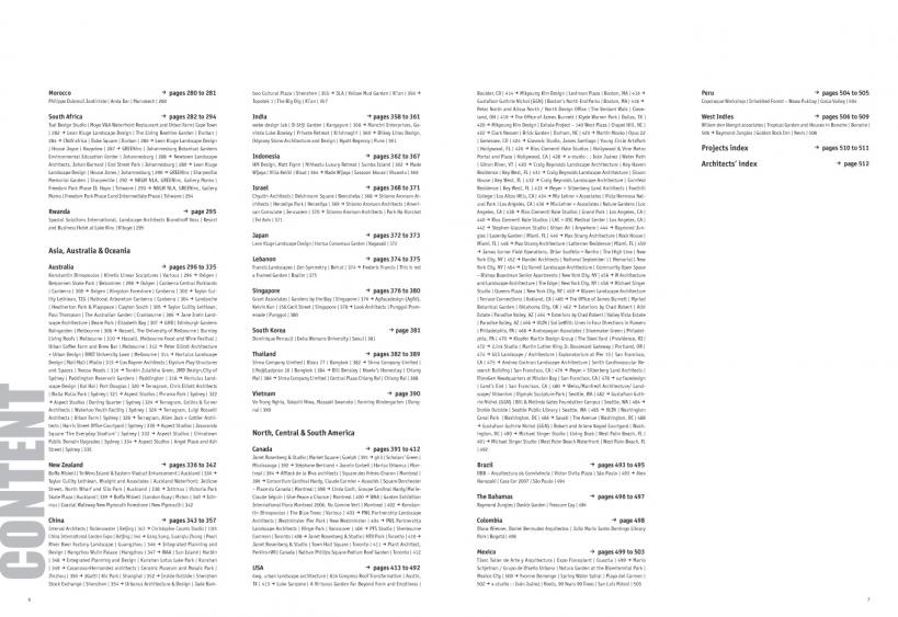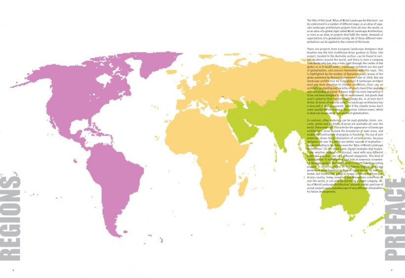 Атлас мировой ландшафтной архитектуры представляет собой обширное и многогранное собрание различных проектов ландшафтного обустройства пространства. Эти проекты могут быть строгими или игривыми, кричащими или романтическими, откровенными или сдержанными. Поскольку основными «строительными материалами», используемыми при реализации этих проектов, являются деревья и кустарники, трава и цветы, объекты ландшафтной архитектуры подвержены постоянным изменениям.