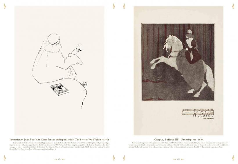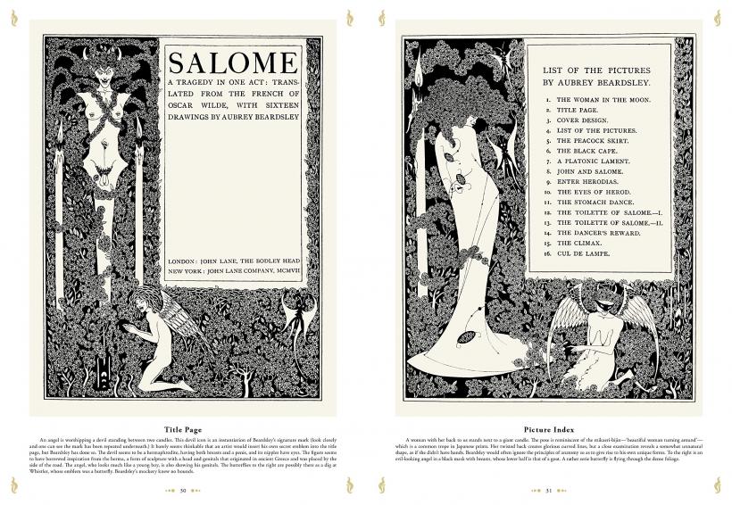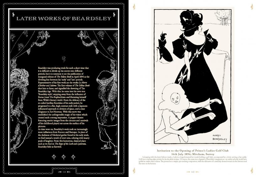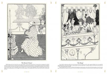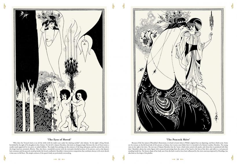 The most famous examples are his illustrations for Oscar Wilde's Salome, Sir Thomas Malory's Le Morte d'Arthur, Edgar Allan Poe's Tales of Edgar Allan Poe, "Alibaba and the Forty Thieves" from One Thousand and One Nights, the French magazine Yellow Book, and the play Lysistrata. The illustrations for these literary and theatrical artworks had also been drawn by many other illustrators, but Aubrey's work was totally different from anyone else's. The seductive motifs that he drew, using only black ink, such as a woman with a fearless smile, a gentleman with disdainful contempt, and figures with extremely exaggerated genitals, all express Aubrey's incomparable talent for grasping the chaos and unsettled atmosphere of the period. The rebellious nature and imagery of his illustrations were often controversial. People even called him "the Devil's younger brother". But there is no doubt that he was a star of the age, which is evident from the many influential illustrators who came after him who were influenced by Aubrey's work, such as Harry Clarke, Alastair, John Austin, Kay Nielsen and George Barbier.