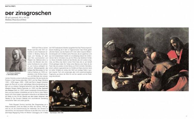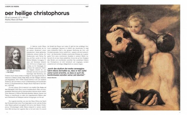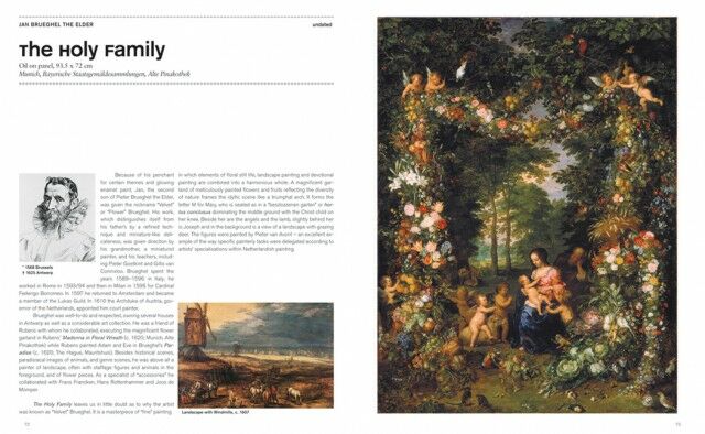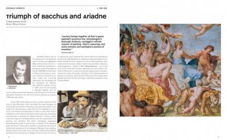* a selection of the most important works of the epoch; each is presented on a 2-page spread with a full-page image and, on the facing page, a description/interpretation of the work and brief biography of the artist as well as additional information such as a reference work, portrait of the artist, and/or citations