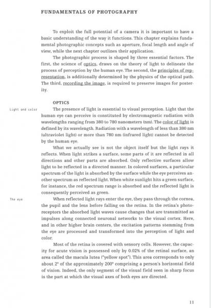 - Photographic concepts (focal length, image circle, angle of view, depth of focus, exposure time, contrast range, etc.)