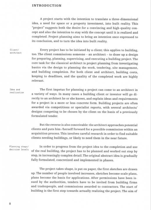 The main task of the classical architect is project planning, from basic evaluation to design all the way to execution planning, the call for bids, construction management, and completion of the building. This volume explains the individual planning steps in context, presents the networking of the various specialists involved in the project, and offers a clear and practical description of the various levels of organization.