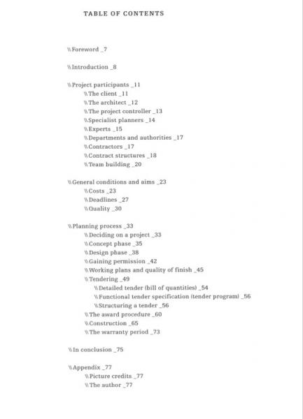 Themes are - Planning steps from basic evaluation to handing over the keys, - Project participants (including the authorities, specialized planners, construction firms, etc.), - Organizing the plan (sequence, what’s needed when?, work organization, documentation), - Coordination of the participants.
