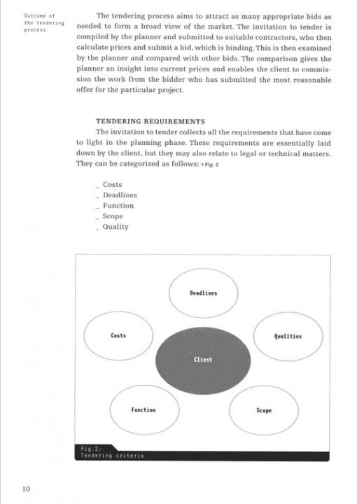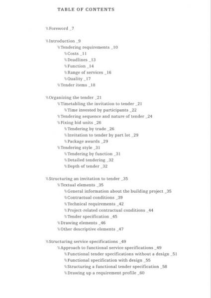 Tendering constitutes the transition from the drawing and planning stage to the construction phase. In addition to its economic and contractual dimension, it is also an essential tool for translating design quality into built quality. This volume presents various ways to put construction works out to tender. In addition, it explains in practical terms how to describe construction work and how to prepare all of the documentation required for a complete invitation to tender.