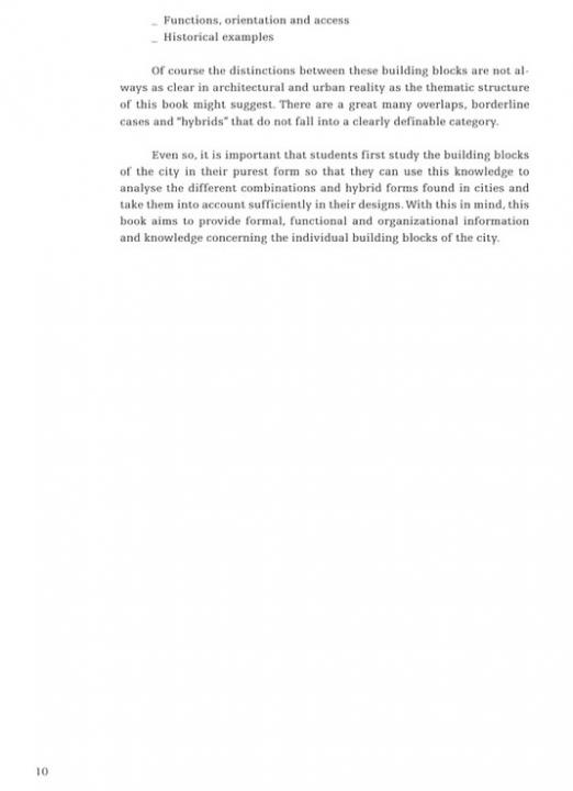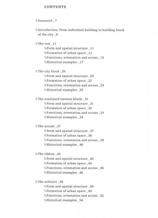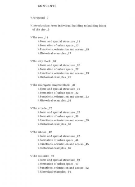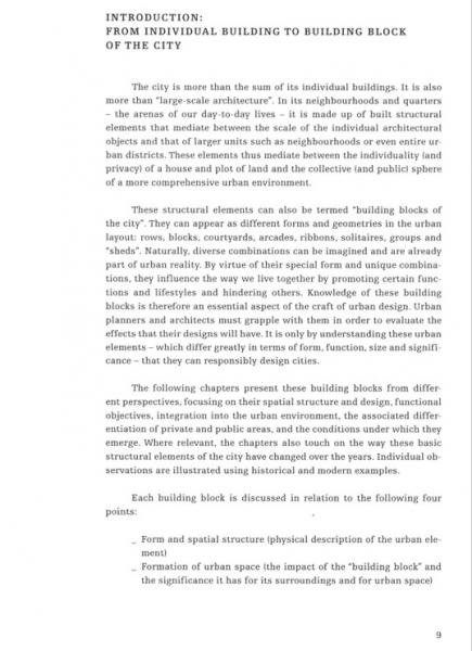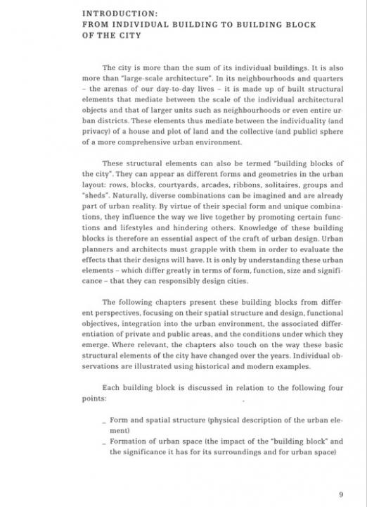 Our cities and neighborhoods are composed of Urban Building Blocks and a knowledge of these elementary components is part of the basic equipment of city planning. It is absolutely essential for urban design that one understands their form and structure, their functional conditions, and the differentiation into private and public spheres, as well as the ways they are networked into their surroundings. Study of these city building blocks represents a first step toward understanding, and successfully developing the built structure of the city as a physical and social habitat.