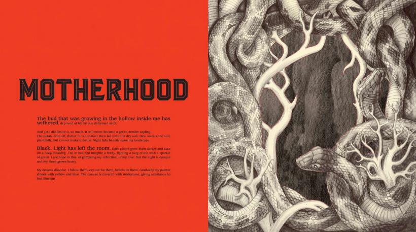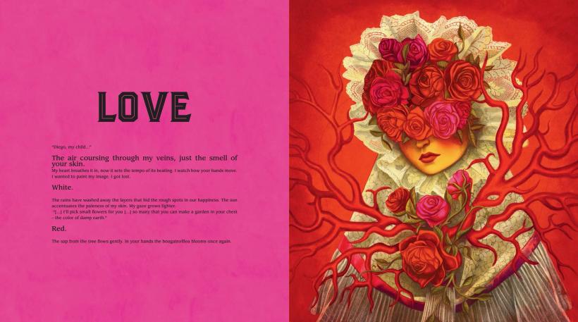 Through a series of consecutive die-cut pages, one is drawn in - passing through aspects of her life, art and creative process while exploring the themes that inspired her most, such as love, death and maternity.