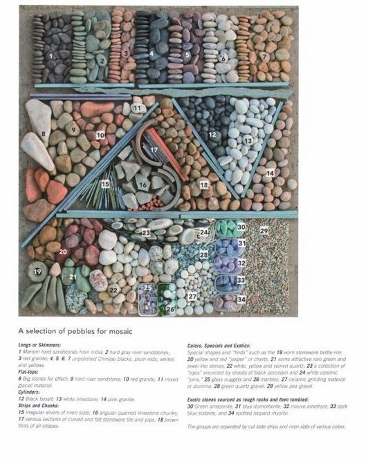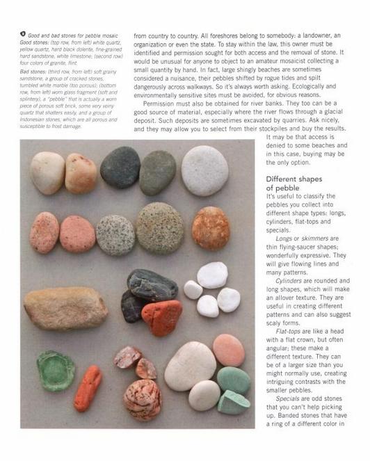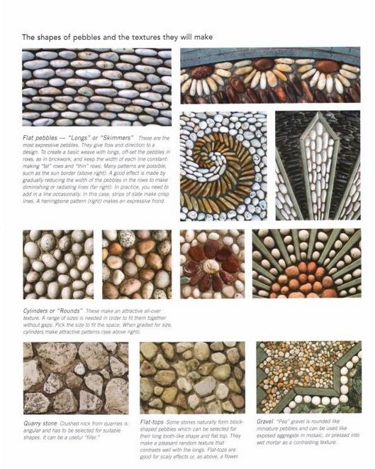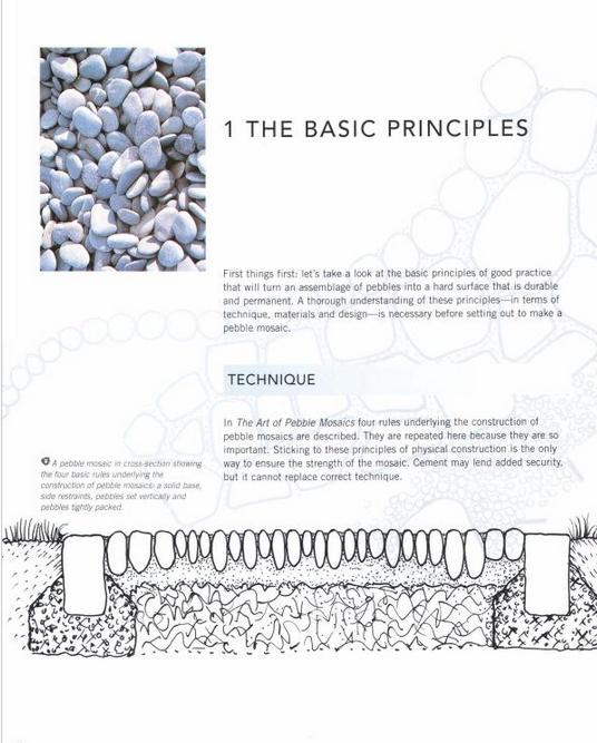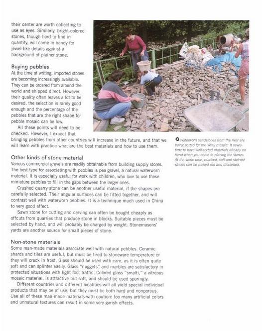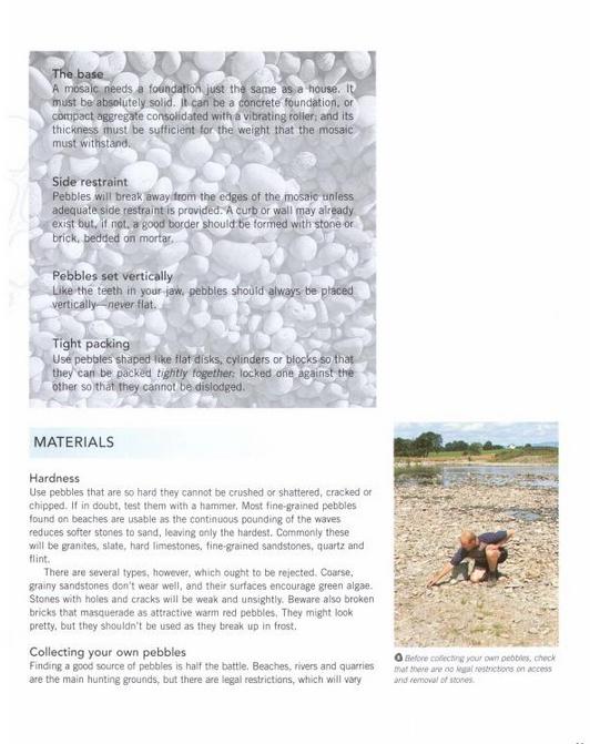 The book lists the best sources to find or buy pebbles; how to choose and test pebbles for strength and quality; and which materials to avoid. There are practical instructions for ensuring the mosaic can withstand frost, foot and vehicle traffic, pollutants, and water.