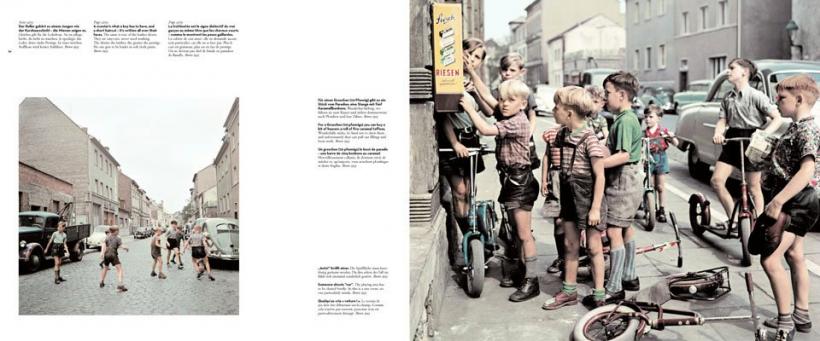 The photographs portray a country caught between the opposite poles of technological modernism and cultural restoration, between affluence and penury, between German Gemütlichkeit and the constant threat of the Cold War. They show the winners and losers of the "economic miracle," people from all social classes, at home, at work, in their very limited free time and as consumers. But they also show a country that looks, in retrospect, like a film from the middle of the last century. Of his color photographs, the Frankfurter Allgemeine Zeitung wrote, "they are exceptional contemporary documents indicating how swiftly the grayness of everyday life became infused
