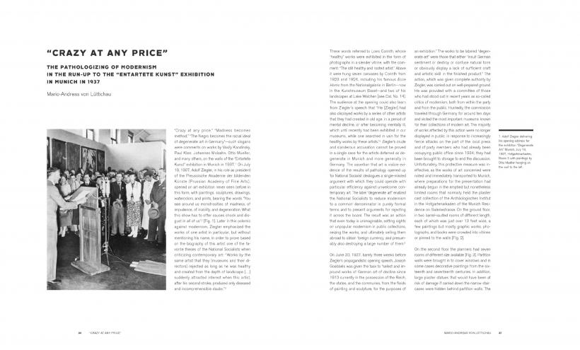 The book contains reflections on the genesis and evolution of the term “degenerate art” and details of the National Socialist policy on art. Art works from the exhibition Degenerate Art are compared to works of art from The Great German Art Exhibition, which was held at the same time and displayed the works of officially approved artists. The book also presents the after-effects of the attack on modernism that are felt even today.