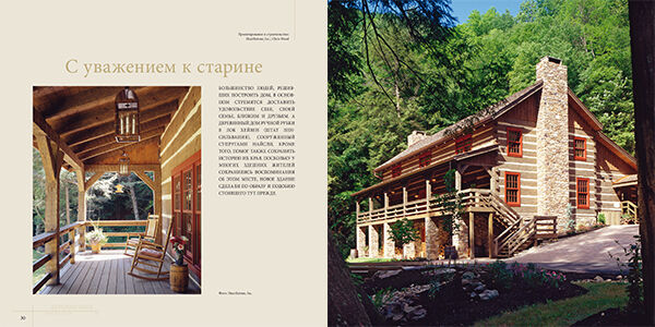 Иными словами, в каждом проекте нашего альбома отражено мастерство тех первопроходцев, что возводили свои жилища в Монтане, Виргинии, Айдахо, Пенсильвании, Висконсине, Юте, в горах и девственных лесах, на берегах озер и рек, с помощью незамысловатых инструментов обрабатывая древесину белой восточной сосны, красного канадского кедра, канадской ели, дугласовой пихты. И, конечно, искусство современных мастеров.