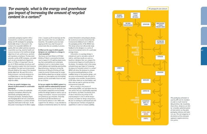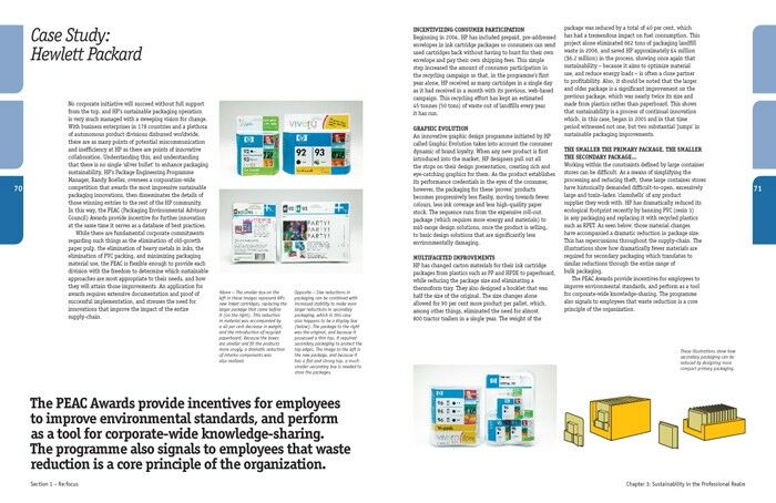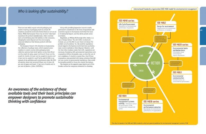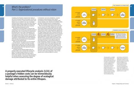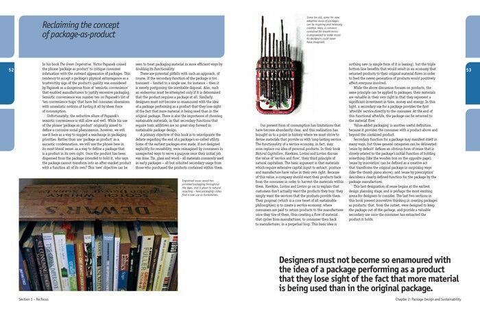 In the first part of the book, after introducing the student to the background of packaging design and its purpose, the author focuses on issues of sustainability. Through a series of case studies and interviews he looks at some of the companies that are leading the way in sustainable packaging.