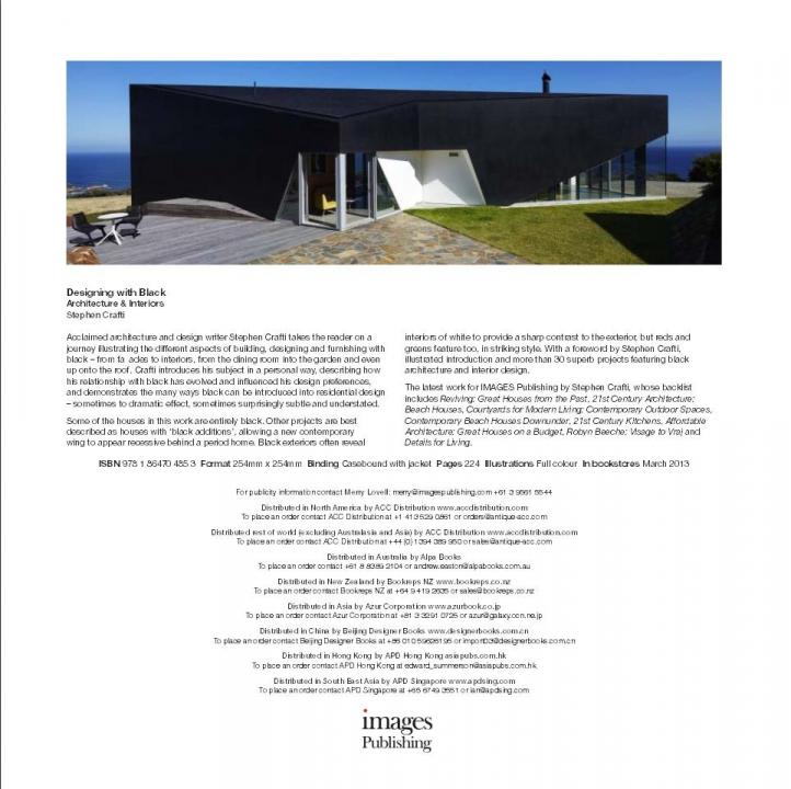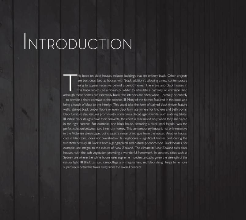 Crafti doesn't live in a black house, but he recently upgraded a 1930s home. Everything I touched was changed to black, from the timber fences to the timber floorboards. I even added black curtains and planted black beared irises in his garden. Using black seemed to unify disparate elements in and around his home. While there are numerous black features in Crafti's house, his ideal would be to live in a contemporary black house, with black furniture and black walls. And maybe even a garden filled with black plants. This book, showcasing black houses, is the starting point towards this goal.
