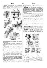 C’est une mine de renseignements où le lecteur trouvera la définition de milliers de termes techniques utilisés par les artisans du bois, coiffant tout le vocabulaire spécifique ou commun aux trois disciplines. Il permet de connaître la terminologie dont la plus grande partie est toujours en usage de nos jours,.et donne des indications précieuses sur les méthodes traditionnelles utilisées dans les métiers du bois. De très nombreux dessins techniques, schémas et illustrations viennent enrichir les définitions.