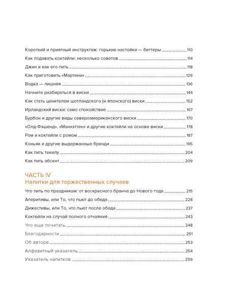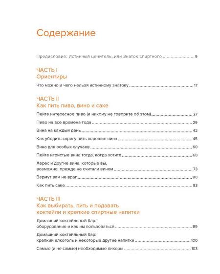 Я подробнее останавливаюсь на темах, которые, как мне кажется, будут для вас особенно полезны, а также на тех (например, виски), которые требуют более глубоких познаний, чтобы легко в них ориентироваться. Вам может показаться, что с вином я расправился слишком быстро (просто я считаю, что ему посвящено достаточно книг). Я вовсе не касаюсь таких тем, как сидр, пунш и десертное вино, поскольку считаю, что вы способны разобраться в них и без меня. Идея была не в том, чтобы досконально разобрать абсолютно каждый аспект потребления спиртных напитков. Я попытался лишь подтолкнуть вас, дать для начала самые необходимые знания из тех, что я накопил за много лет". -- Адам Макдауэлл