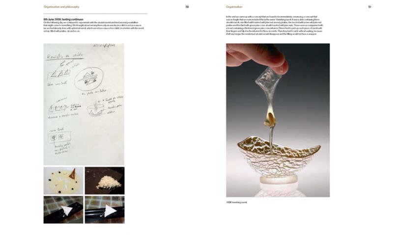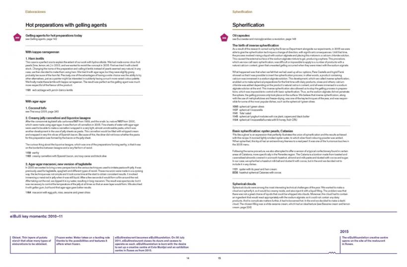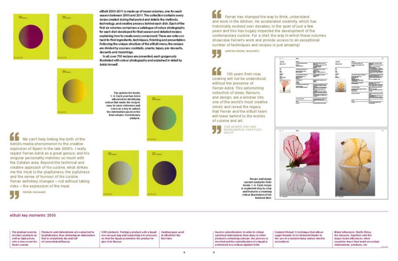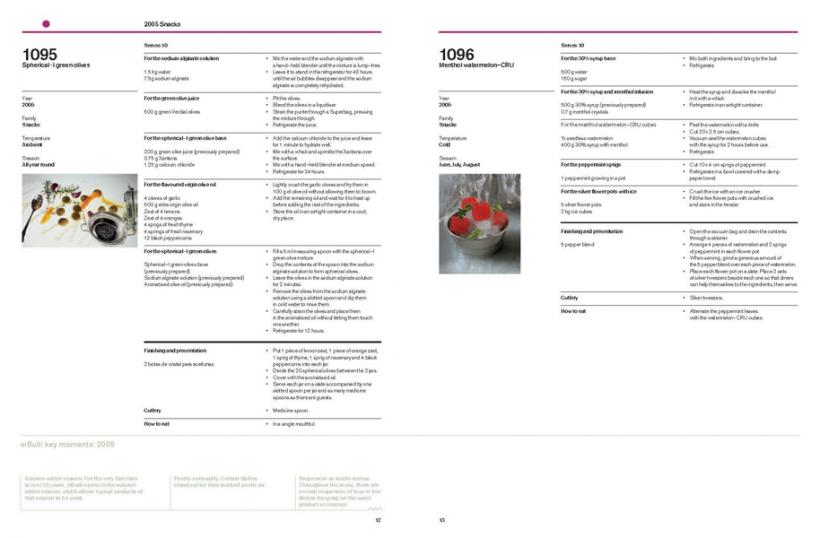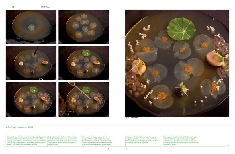 elBulli 2005-2011 is made up of seven volumes, one for each season that the restaurant was open between 2005 and 2011. Each volume starts with a catalogue of photographs of every dish that was served at the restaurant during that year and finishes with detailed recipes explaining how to make every component. There are also notes on hard-to-find ingredients, new techniques, finishing and presentation. The recipes are divided by course, following the unique structure of the elBulli menu: cocktails, snacks, tapas, pre-desserts, desserts and morphings.