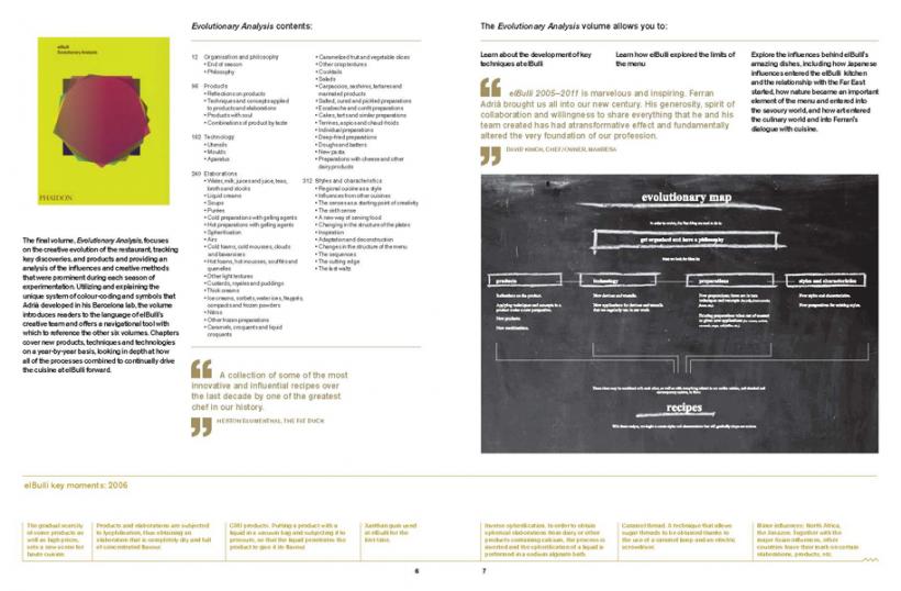 The final volume, Evolutionary Analysis, focuses on the creative evolution of the restaurant, key discoveries, produce and analysis of the influences and creative methods that were prominent during each season. Chapters will cover new products, techniques and technologies on a year-to-year basis, looking in depth at how all of the processes combined to continually drive the cuisine at elBulli forward.