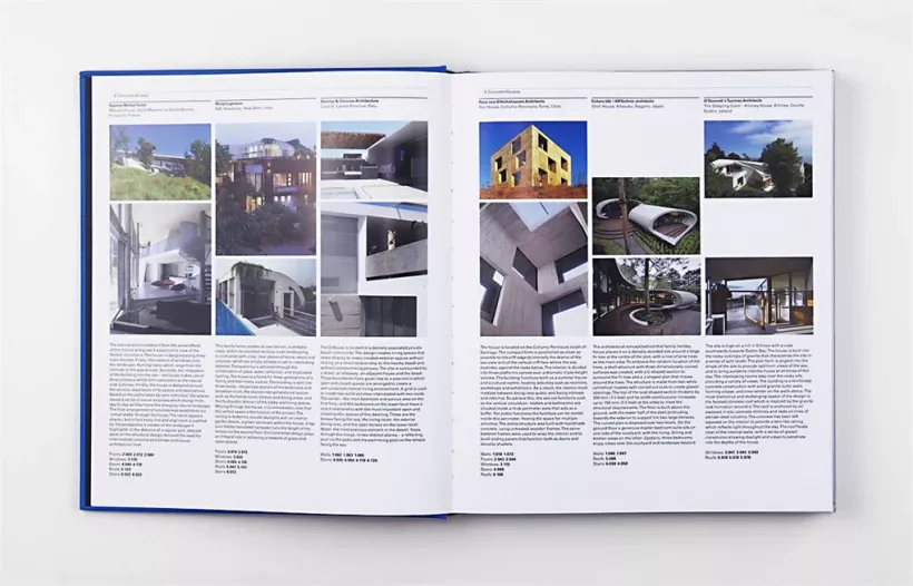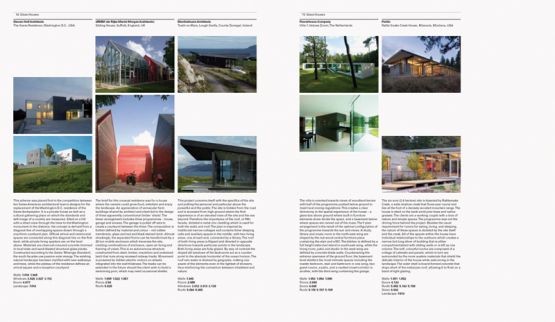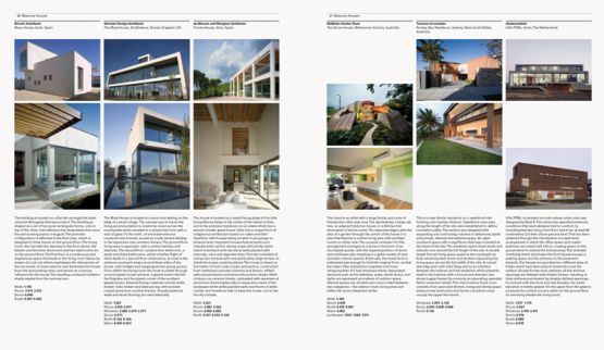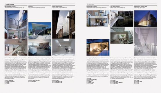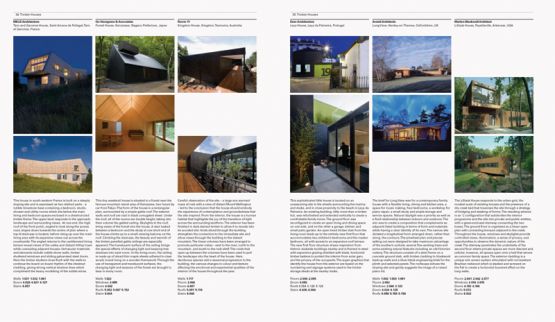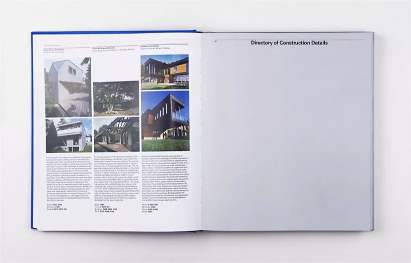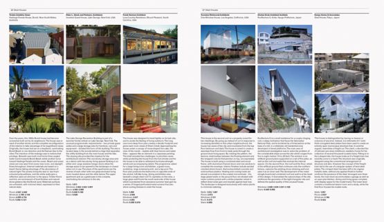 The opening section of the book forms a directory that shows interior and exterior images of the source houses, together with credits, a brief descriptive text and information as to which details from that house are included. The houses in this section are organized by main construction material (wood, concrete, glass etc).