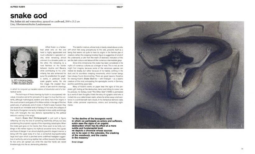 Artists featured: Balthus, Hans Bellmer, Arnold Böcklin, Fernando Botero, Maurizio Cattelan, Jake and Dinos Chapman, Salvador Dalí, Paul Delvaux, Peter Doig, Alfred Kubin, James Ensor, Max Ernst, Ernst Fuchs, Frida Kahlo, Gustav Klimt, Joan Miró, Sidney Nolan, Odilon Redon, Dorothea Tanning, Franz von Stuck, Andrew Wyeth