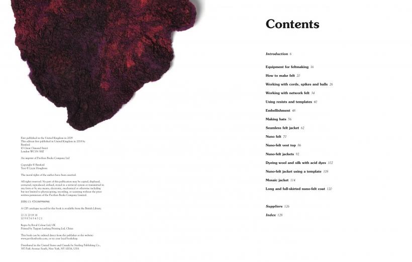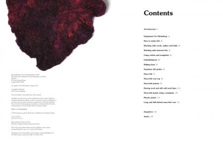 The book covers: how to make basic felt; embellishing felt; corsages; earrings and other jewellery; scarves; nuno felt techniques; hat-making; felt sleeveless top; felt skirt; felt jacket, including nuno felt jacket; and, felt coat.