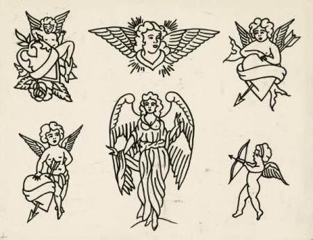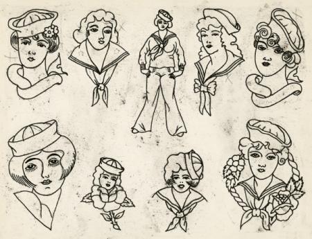 This is the only known art that has survived from this shop, where Samuel J. O'Reilley's modern-day electric tattoo machine was born and patented. The imagery of this classic flash preserves the origins of American tattoos when tattoo art was transferred to the client from these templates via an acetate stencil. Everything was done by hand until O'Reilley's electrified tattoo machine changed history.