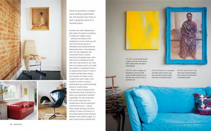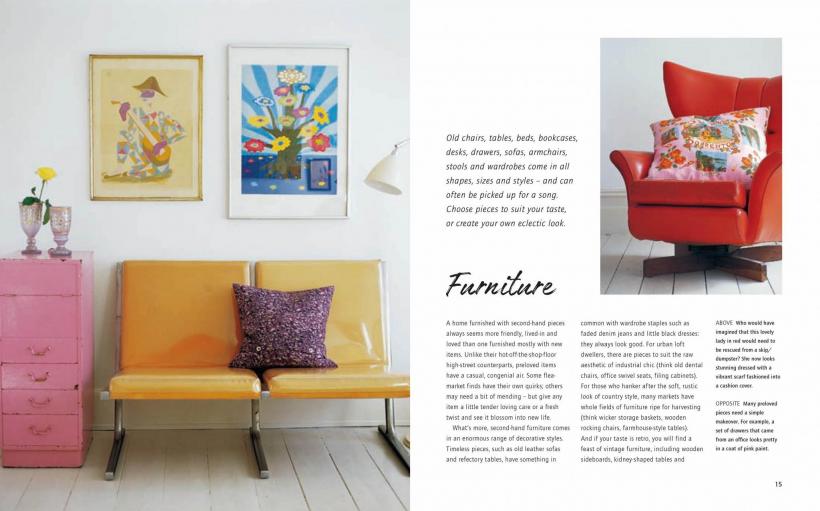 The first section of the book, Flea Market Finds, covers the range of second-hand, salvaged and vintage objects on offer. Whether your style is retro, minimalist or eclectic, you can seek out unique pieces of furniture, lighting, glassware, kitchenware or fabrics that appeal to you. Once you have acquired a feel for what’s out there, the second part of the book, Putting It All Together, demonstrates how to transform any interior room by room. It covers spaces to cook, eat, sleep and relax, as well as bathrooms and home offices. The book ends with hints and tips on how to source the right piece for the right place.