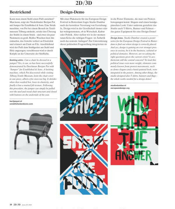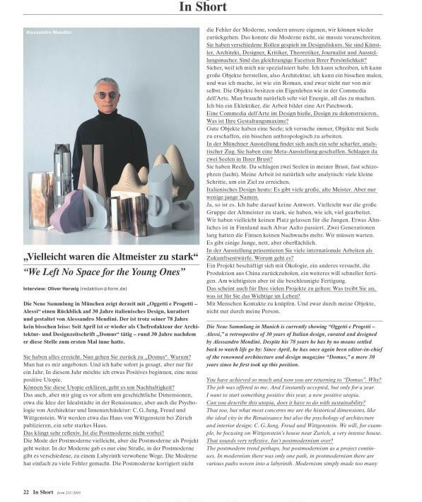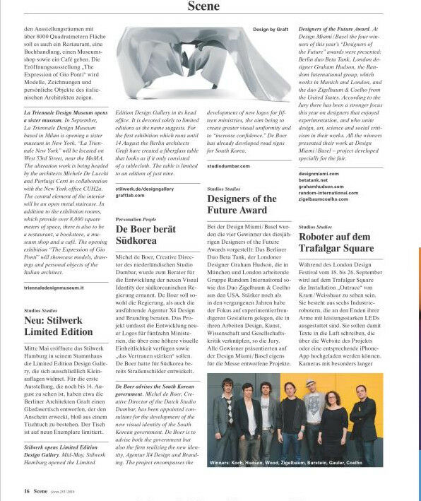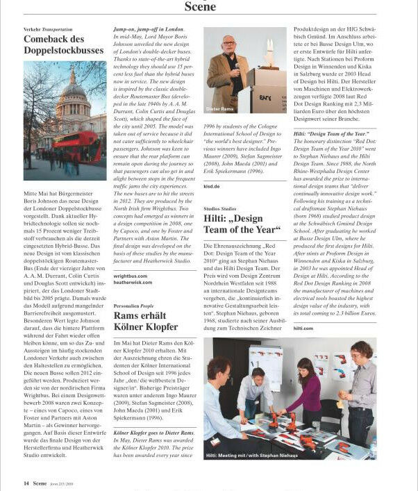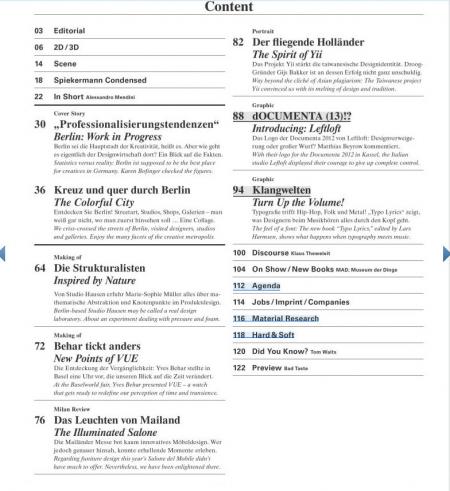Anyone wanting to find out about the current design trends needs and reads form, the international design magazine. Each issue focuses on the design process proper: Wide-ranging features offer insights into how extraordinary products and graphic projects have unfolded. In form, renowned designers and specialist authors comment, but promising new talents also get their say. An up-to-date layout, refined printing graphics and contributions by visual designers ensure form is a special visual and haptic experience. As a trade journal, it provides in valuable information on new materials and production technologies, as well as theoretical essays and tips for everyday life as a designer.