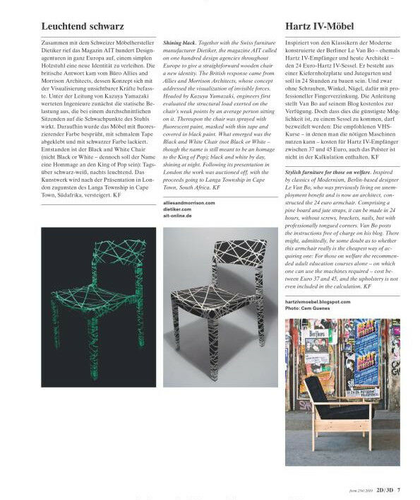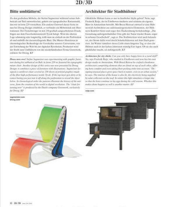 Anyone wanting to find out about the current design trends needs and reads form, the international design magazine. Each issue focuses on the design process proper: Wide-ranging features offer insights into how extraordinary products and graphic projects have unfolded. In form, renowned designers and specialist authors comment, but promising new talents also get their say. An up-to-date layout, refined printing graphics and contributions by visual designers ensure form is a special visual and haptic experience. As a trade journal, it provides in valuable information on new materials and production technologies, as well as theoretical essays and tips for everyday life as a designer.
