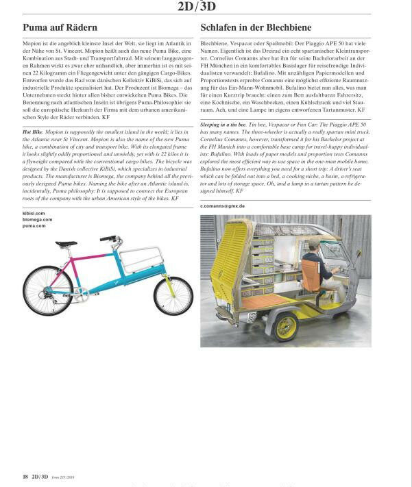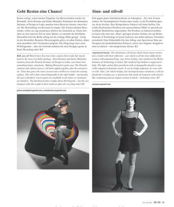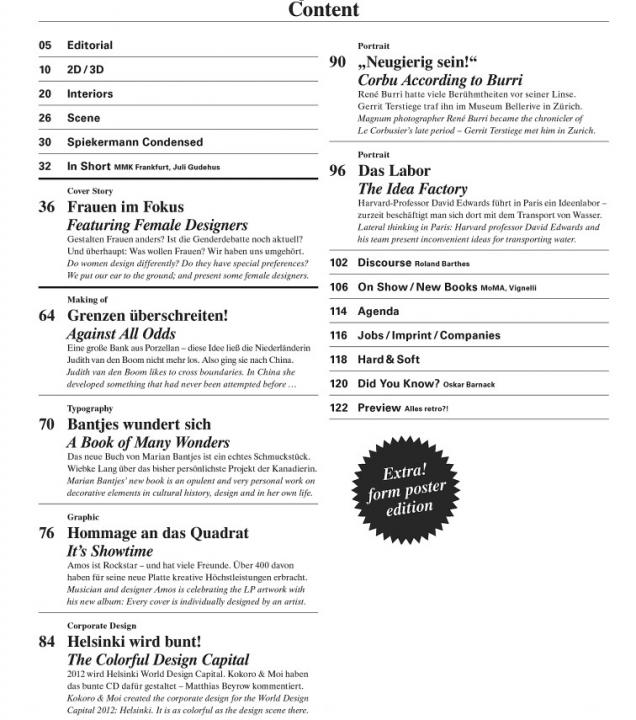 Anyone wanting to find out about the current design trends needs and reads form, the international design magazine. Each issue focuses on the design process proper: Wide-ranging features offer insights into how extraordinary products and graphic projects have unfolded. In form, renowned designers and specialist authors comment, but promising new talents also get their say. An up-to-date layout, refined printing graphics and contributions by visual designers ensure form is a special visual and haptic experience. As a trade journal, it provides in valuable information on new materials and production technologies, as well as theoretical essays and tips for everyday life as a designer.
