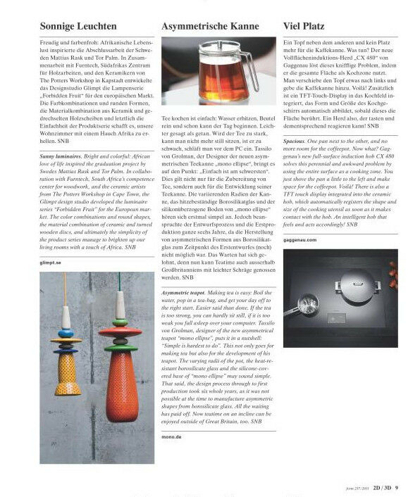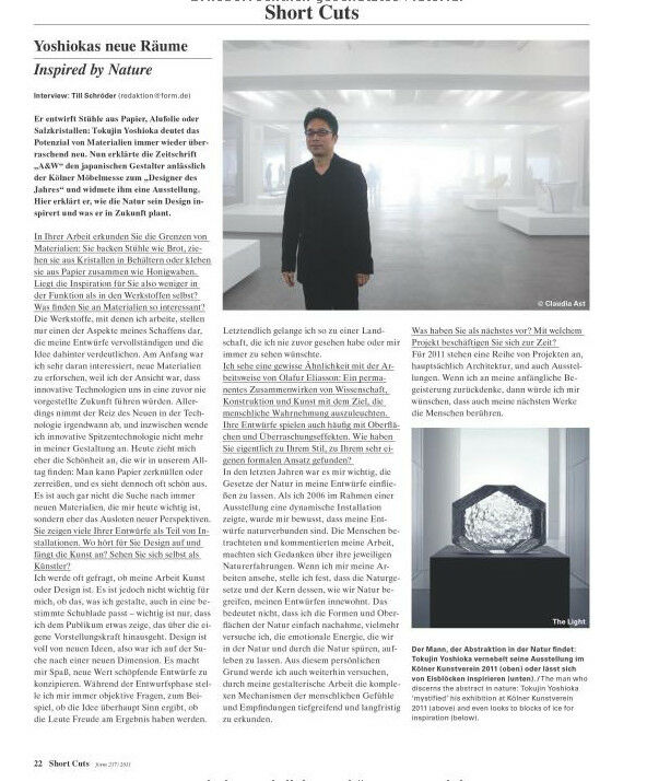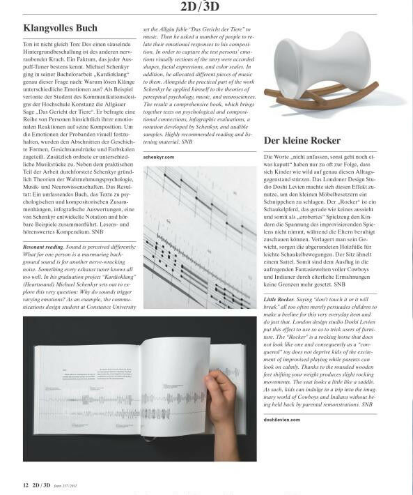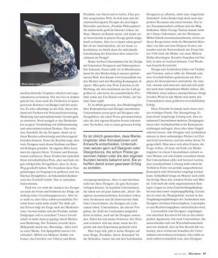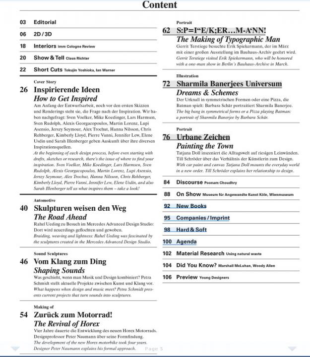 Anyone wanting to find out about the current design trends needs and reads form, the international design magazine. Each issue focuses on the design process proper: Wide-ranging features offer insights into how extraordinary products and graphic projects have unfolded. In form, renowned designers and specialist authors comment, but promising new talents also get their say. An up-to-date layout, refined printing graphics and contributions by visual designers ensure form is a special visual and haptic experience. As a trade journal, it provides in valuable information on new materials and production technologies, as well as theoretical essays and tips for everyday life as a designer.