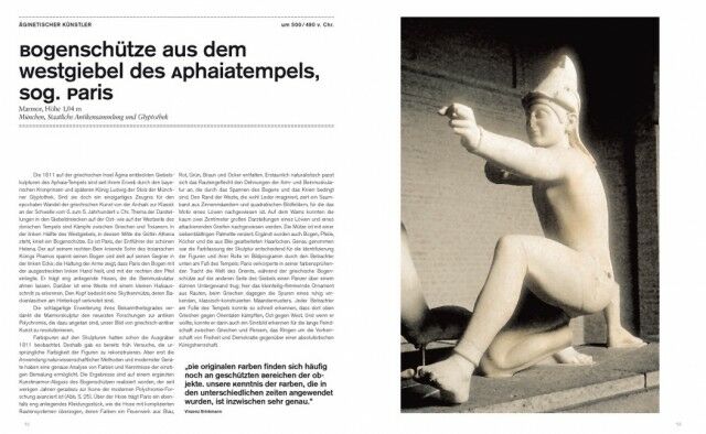 The 18th century`s Neoclassicist movement, with its white marble sculptures inspired by the art of the ancient world, has helped Greek art to remain vivid in our memories even today. But the reality of ancient art was entirely different, as surfaces were in fact much more brut. As author Michael Siebler points out, recent findings have revealed that the seemingly perfect bodies of statues and sculptures were very often painted in flamboyant colors and ornaments. Thus ancient Greek art combined a high level of classical identity with an equal amount of sensuality. Despite being viewed in a new light, the beauty of the works of art persists.