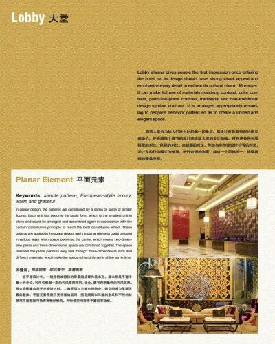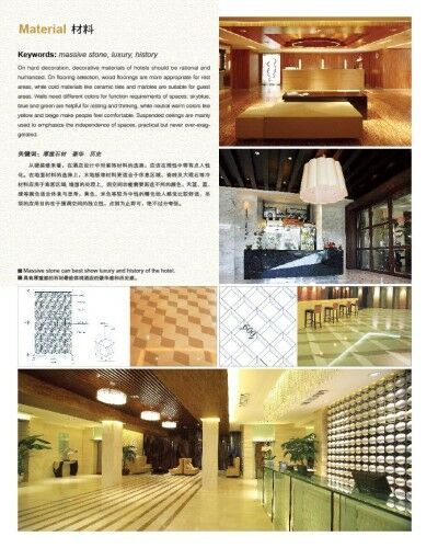 Focus on creative detailed designs of hotel lobbies, banquet halls, conference rooms, guestrooms, bathrooms, gymnasiums, corridors and staircases, referring to applications of planar elements, colors, materials, lightings, walls, floors, ceilings, partitions and interior landscapes in these spaces.