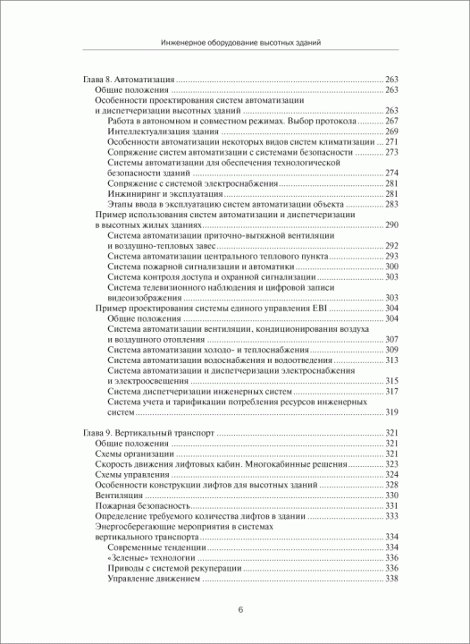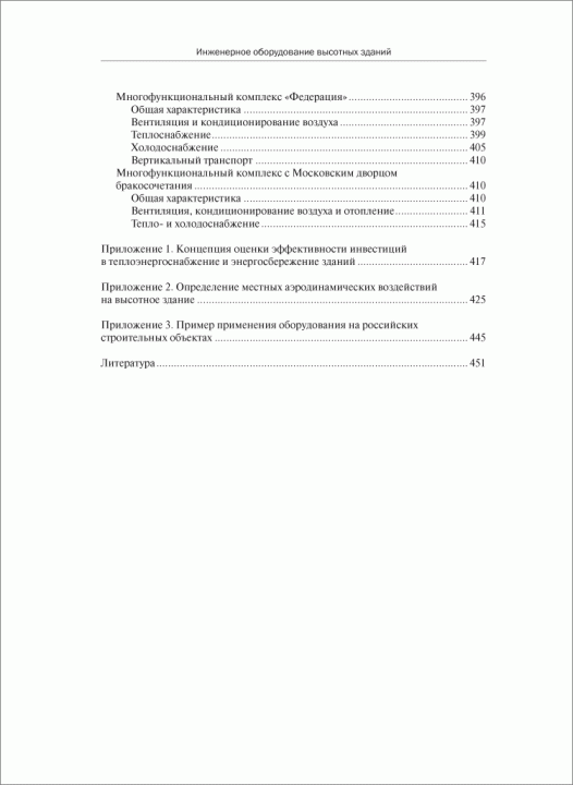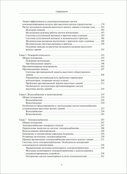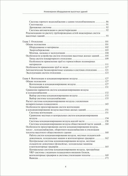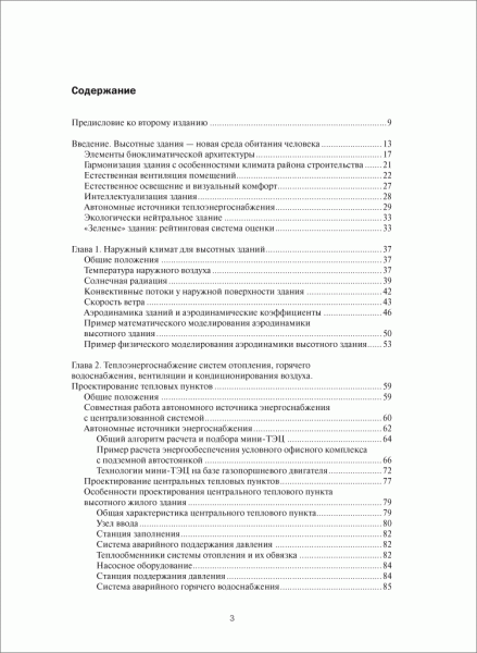 В отдельных главах рассматриваются мировой опыт проектирования инженерного оборудования наиболее известных высотных зданий, параметры наружного климата, особенности проектирования систем теплоэнергоснабжения, отопления, вентиляции и кондиционирования воздуха, пожаробезопасности, водоснабжения и водоотведения, электроснабжения, автоматизации, вертикального транспорта, мусороудаления, бельепровода высотных зданий. Дана подробная характеристика инженерных систем высотных многофункциональных зданий, построенных в Москве за последние годы. В 2010 году книга «Инженерное оборудование высотных зданий» была рекомендована Минобрнауки России в качестве учебного пособия для студентов архитектурных и строительных вузов по специальности 270301 «Архитектура».