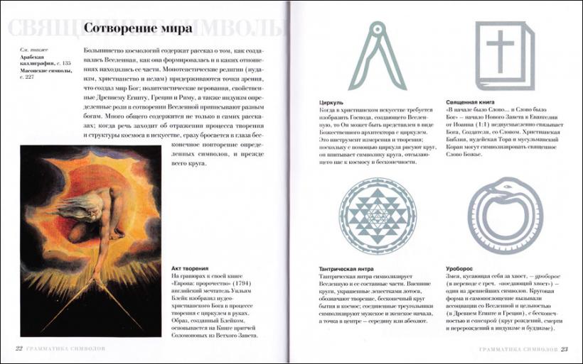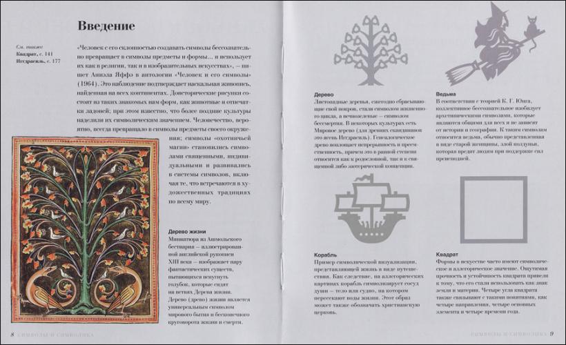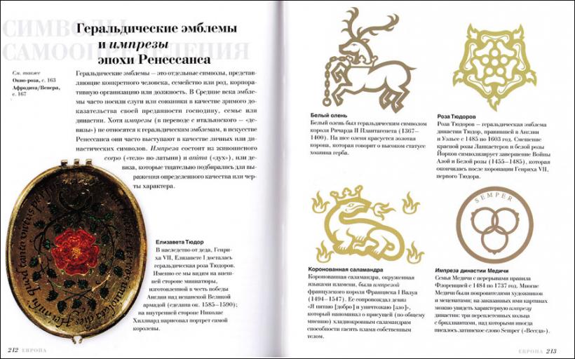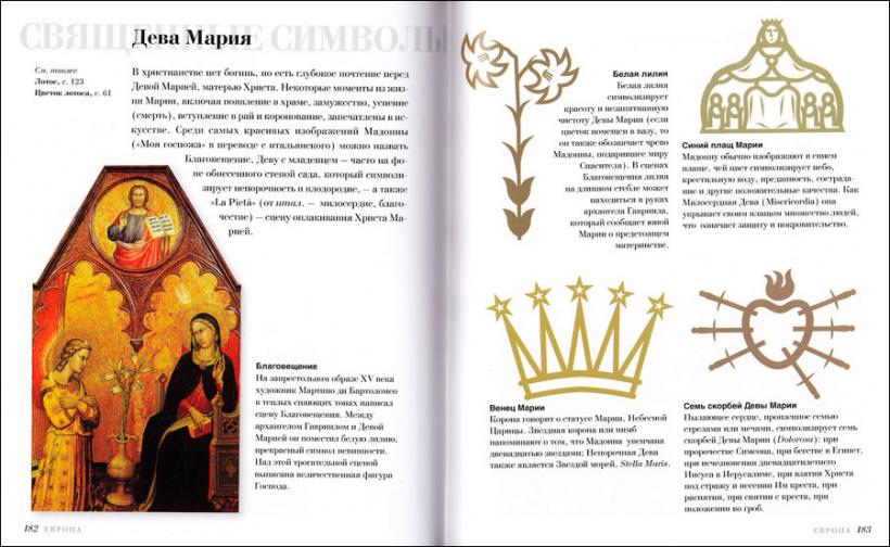 Книга начинается с введения, в котором говорится о символах и их роли в искусстве, далее раскрывается символика каждого континента. Главы строятся по одной тематической схеме, что позволяет сравнить подход к изображению священных образов и созданию аллегорий у разных народов. Иллюстративный ряд дает возможность оценить художественные символы в контексте конкретного произведения. С помощью рисунков и фотографий читатель без труда представит любой символ, начиная с египетских иероглифов и заканчивая западными гербами.
