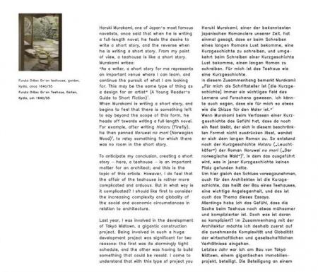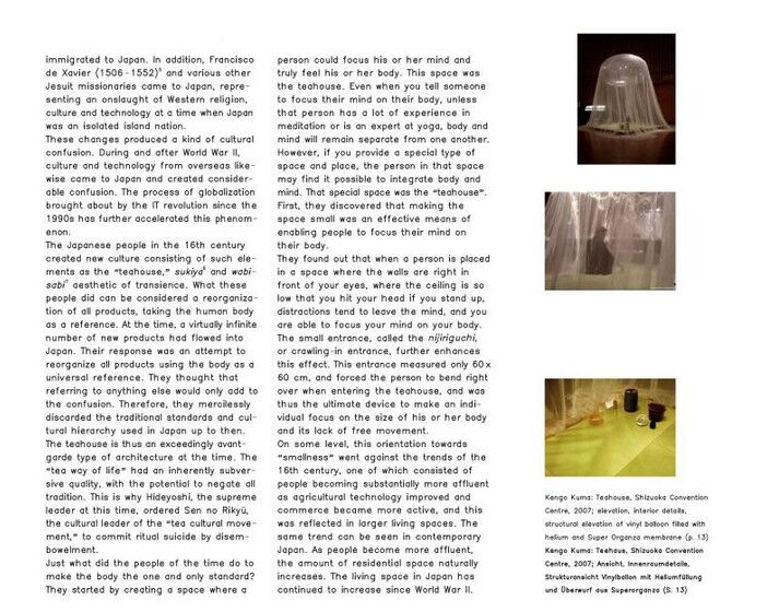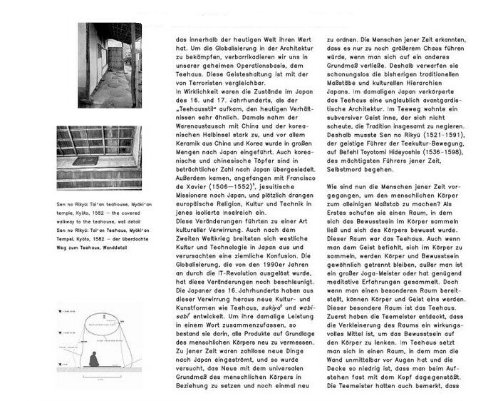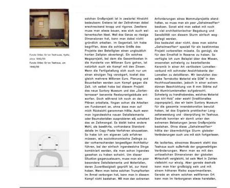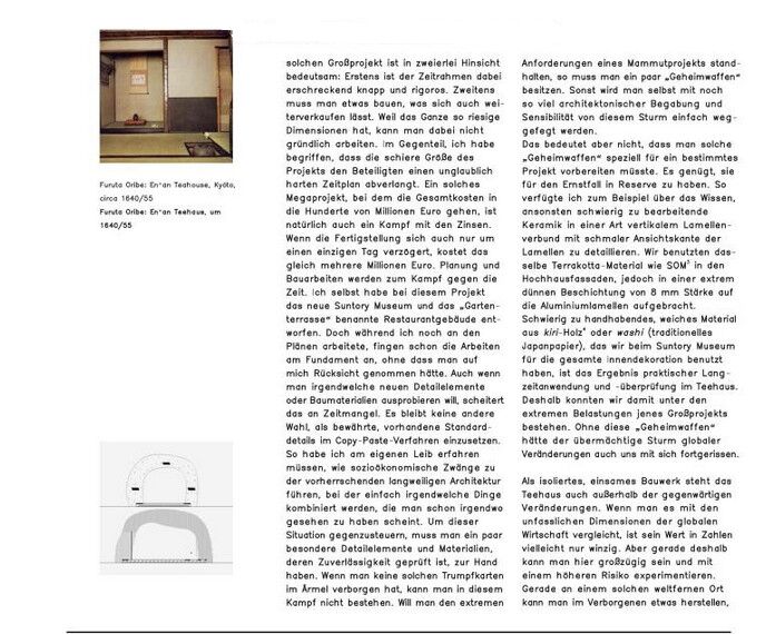 Dieses jüngste Projekt Kumas ist ein Symbol für die traditionsbewusste Modernität des heutigen Japans und seiner Architektur, aber auch ein richtungsweisendes Beispiel temporären und mobilen Bauens, das nur Dank einer ungewöhnlich dichten internationalen Kooperation zwischen Architekten, Ingenieuren und Unternehmen realisiert werden konnte. Das vorliegende Buch entfaltet die technologischen, kulturhistorischen und ästhetischen Aspekte dieser Neuinterpration des japanischen Teehauses.
