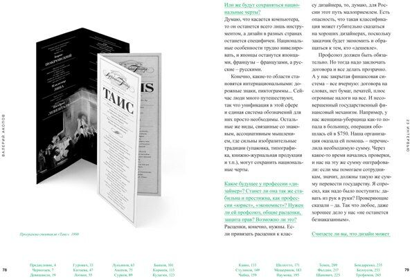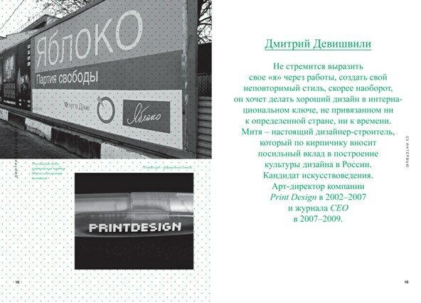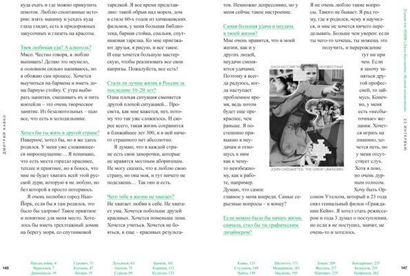Ровно 23 интервью с известными российскими дизайнерами под одной обложкой, такими как Дмитрий Черногаев, Дмитрий Девишвили, Игорь Гурович, Елена Китаева, Андрей Логвин, Степан Лукьянов, Валерий Акопов, Юрий Сурков, Петр Банков, Евгений Корнеев, Анрей Кулагин, Дима Кавко, Денис Стуликов, Владимир Чайка, Aндрей Шелютто, Арсений Мещеряков,Анна Наумова, Протей Темен, Александр Фалдин, Сергей Шанович, Андрей Бондаренко, Эрик Белоусов и Борис Трофимов.